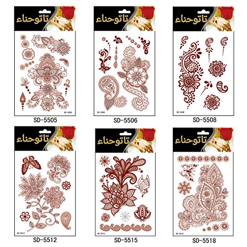 AHIER Henna Tattoo, 6 Sheets Henna Stickers, Waterproof Red Henna Tattoo Stickers for Women