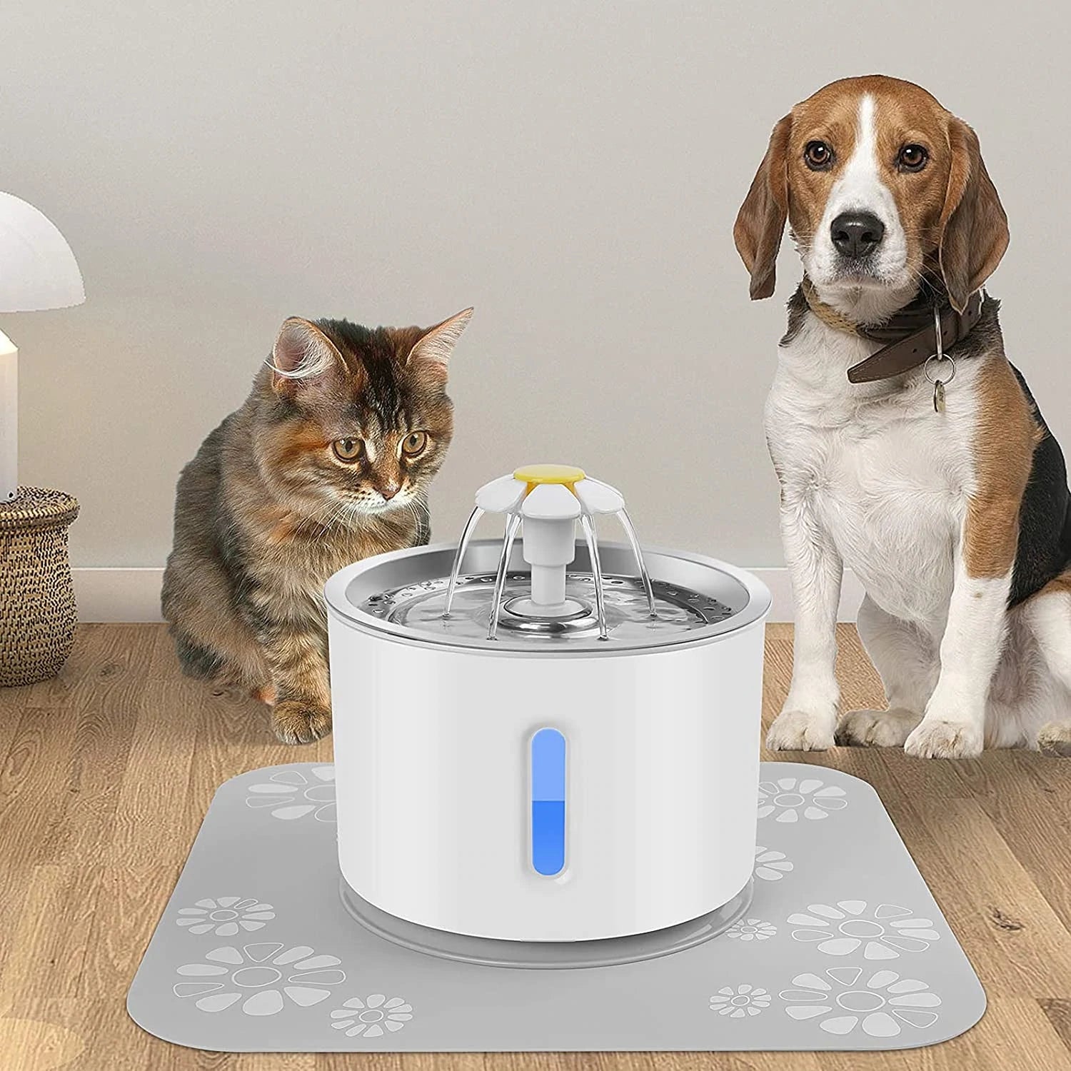 - Includes: A stainless steel pet water fountain(with pump), a waterproof pad, two three-in-one filter cotton, two brush.