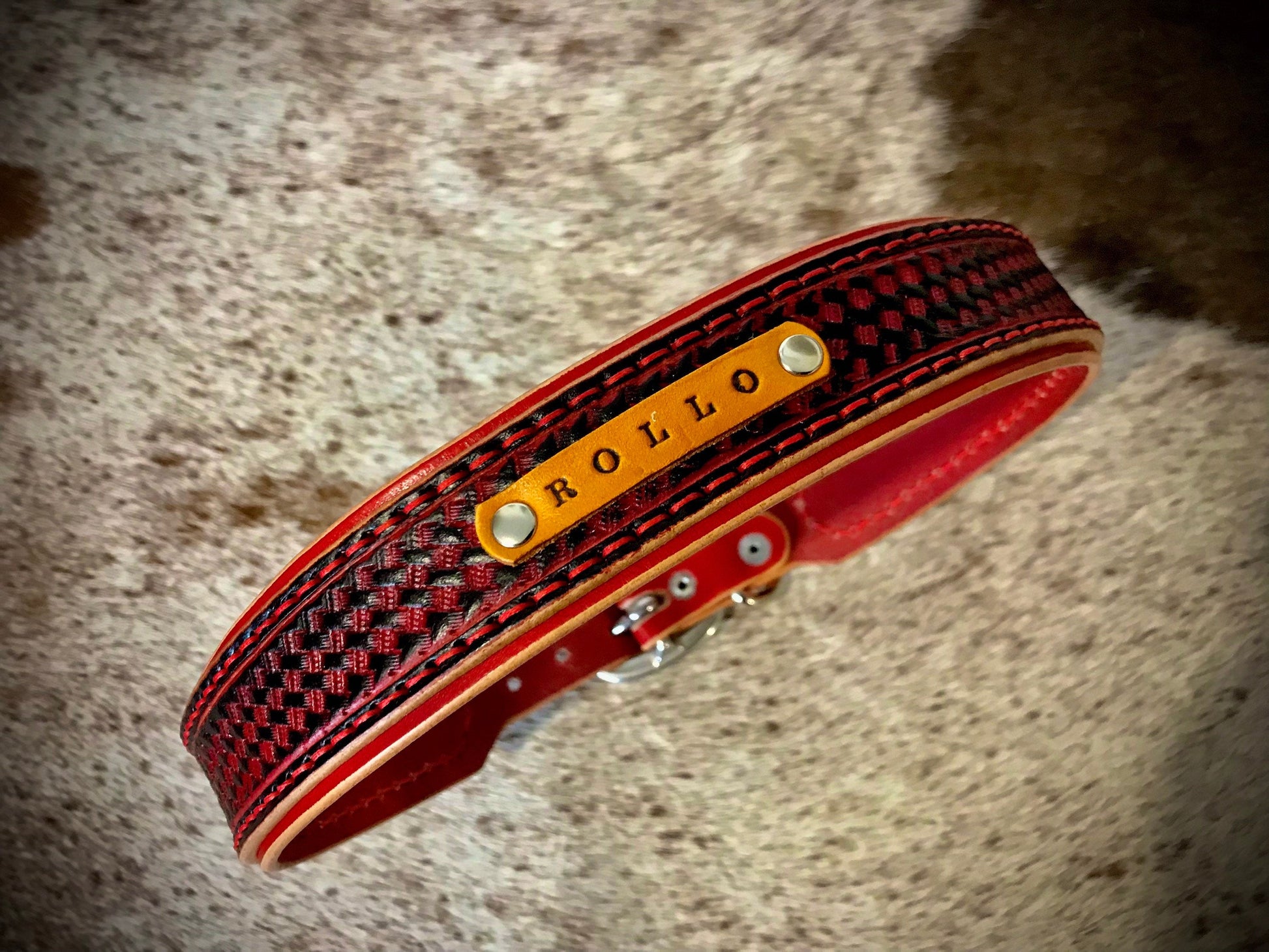 -----ITEM DESCRIPTION----- This durable, personalized and measured to order leather collar is made of genuine leather and I hand tool and dye to make it extra special for you and your pets! Different colours and design can be requested and I will be happy to make it for you. If you would like name, initials, please let me know!!