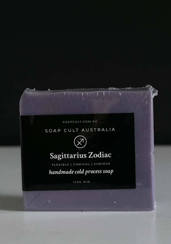Each soap is hand stamped with the symbol for Sagittarius and the product label features some of their best known traits.