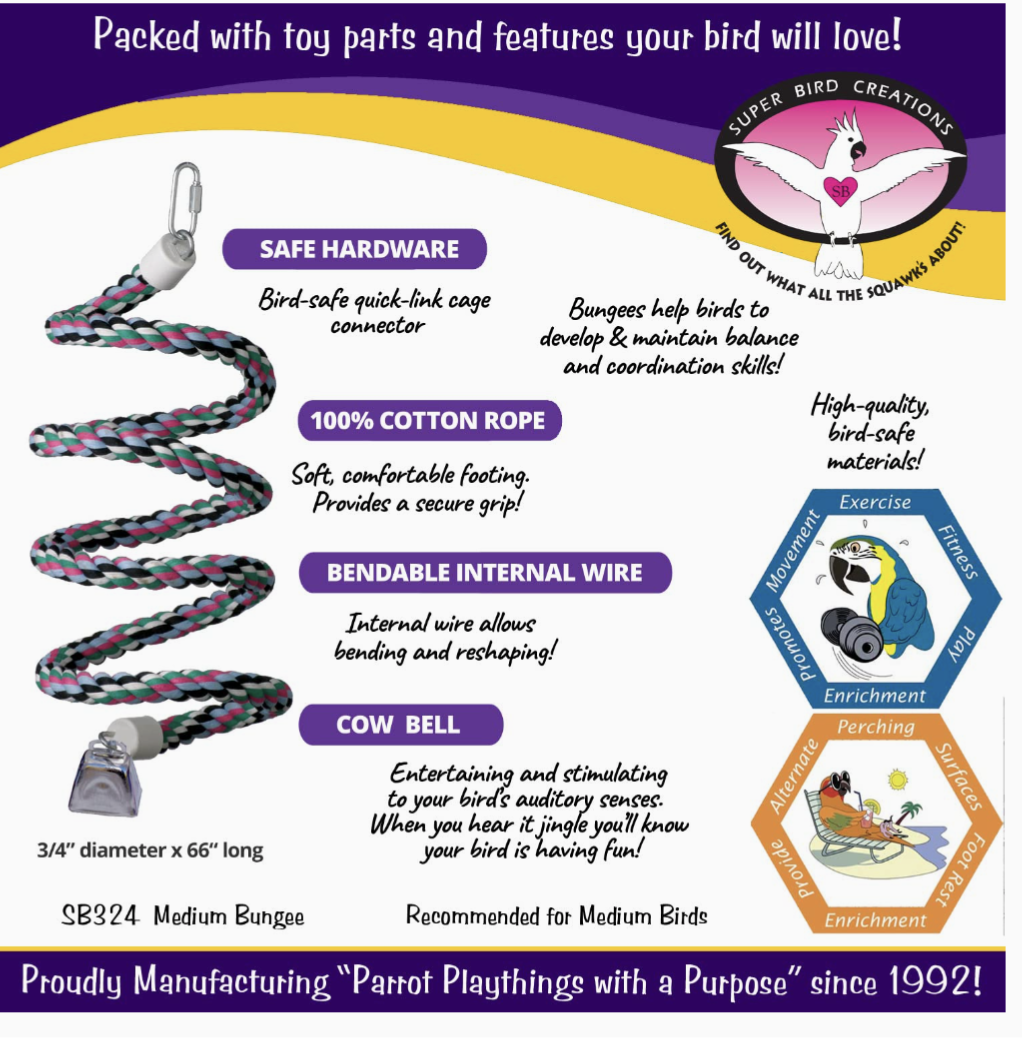 Rope bungees are a great perching alternative that promotes fun, balance and exercise. Every bird needs