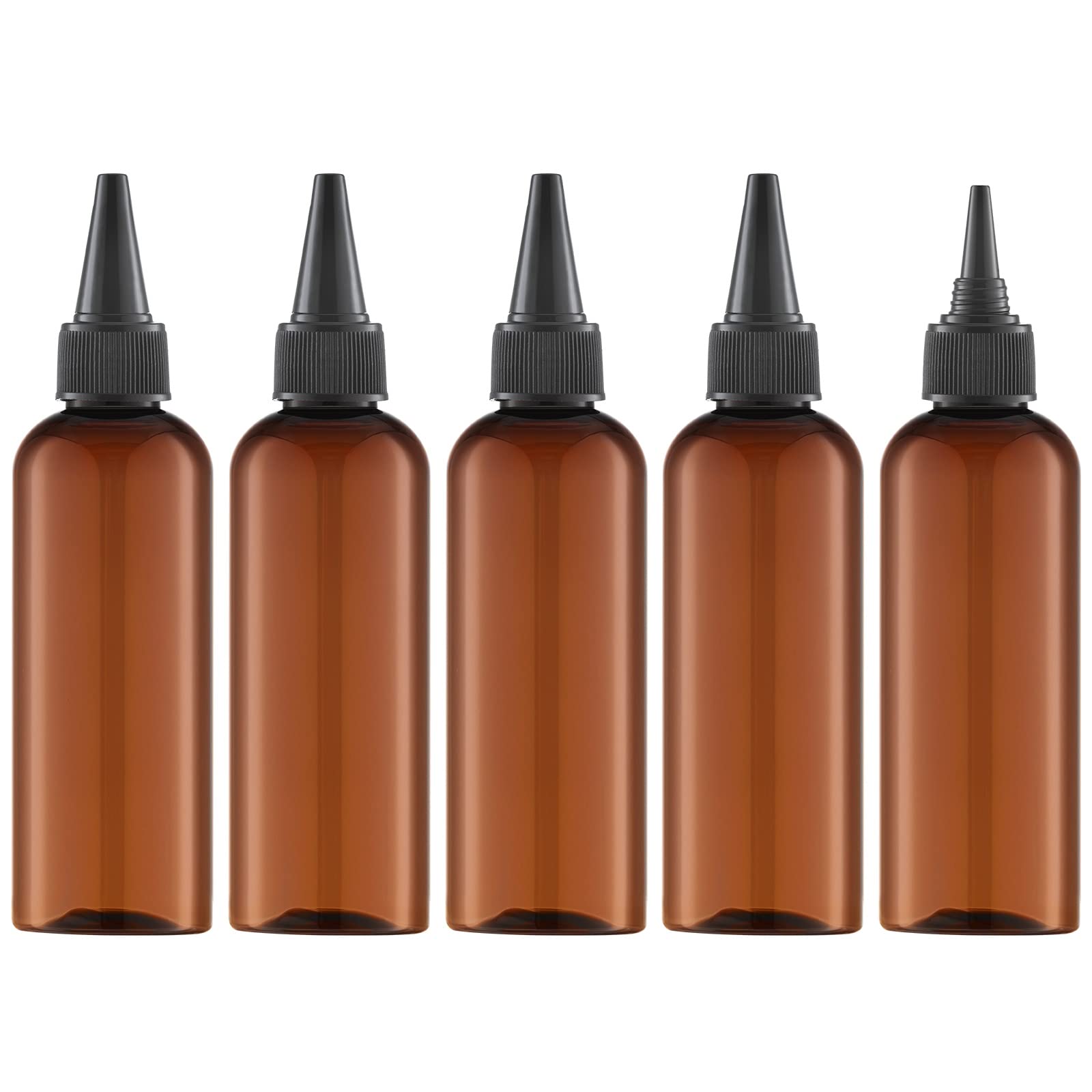 Tekson Hair Color Applicator Bottles, 5 Pack Refillable Squeeze Bottle, Empty Plastic Twist Top Cap Bottles (3.4 OZ, Amber)